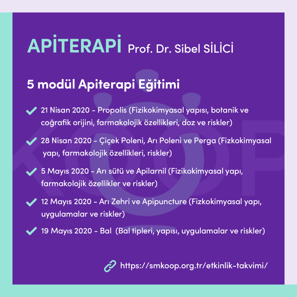 Sağlık Mensupları Kooperatifi (SMKoop) tarafından 21 Nisan-19 Mayıs 2020 tarihleri arasında 5 modül online apiterapi eğitimi düzenlenecek