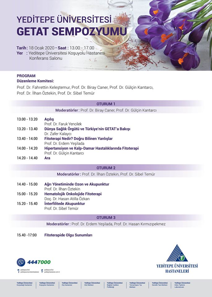 Yeditepe Üniversitesi Koşuyolu Hastanesi’nde gerçekleştirilecek Getat Sempozyumu’nda Hipertansiyon, Kalp Damar Hastalıkları ve Hematolojik Onkoloji’de Fitoterapi Tedavisi ve Fitoterapi’de Doğru Bilinen Yanlışlar, Ağrı Yönetimi’nde Ozon ve Akupunktur, İnterfilite Tedavisi’nde Akupunktur gibi birçok konu ile Dünya Sağlık Örgütü ve Türkiye’nin GETAT’a bakışı ele alınacak.