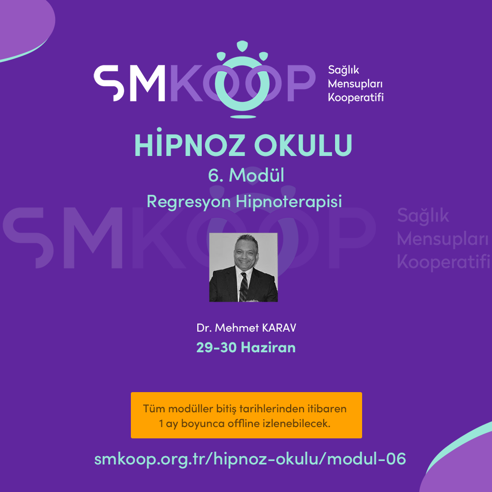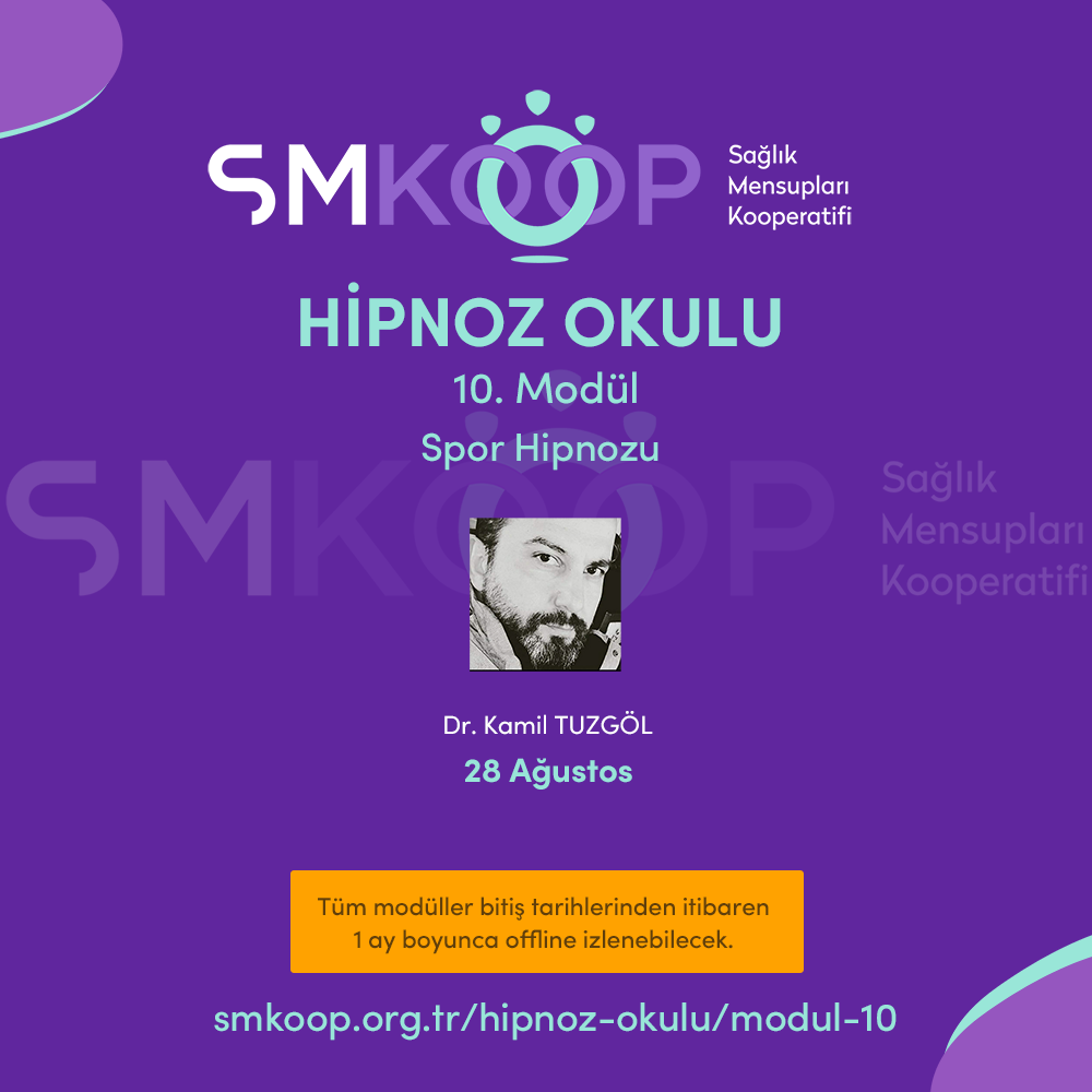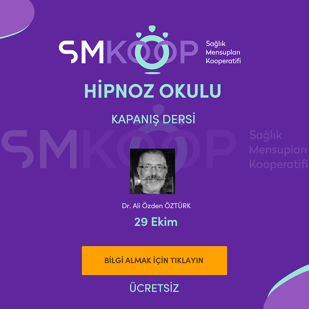 Sağlık Mensupları Kooperatifi (SMKoop) tarafından Hipnoz Okulu etkinlikleri kapsamında 29 Haziran-21 Temmuz 2020 tarihleri arasında toplam 6 gün (12 saat) “Hipnoz Okulu – Temel Bilgiler Eğitimi” düzenlenecek
