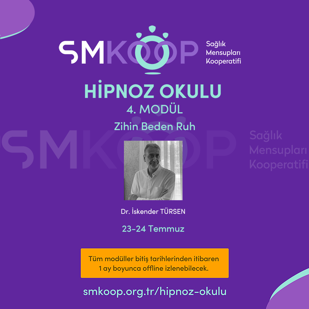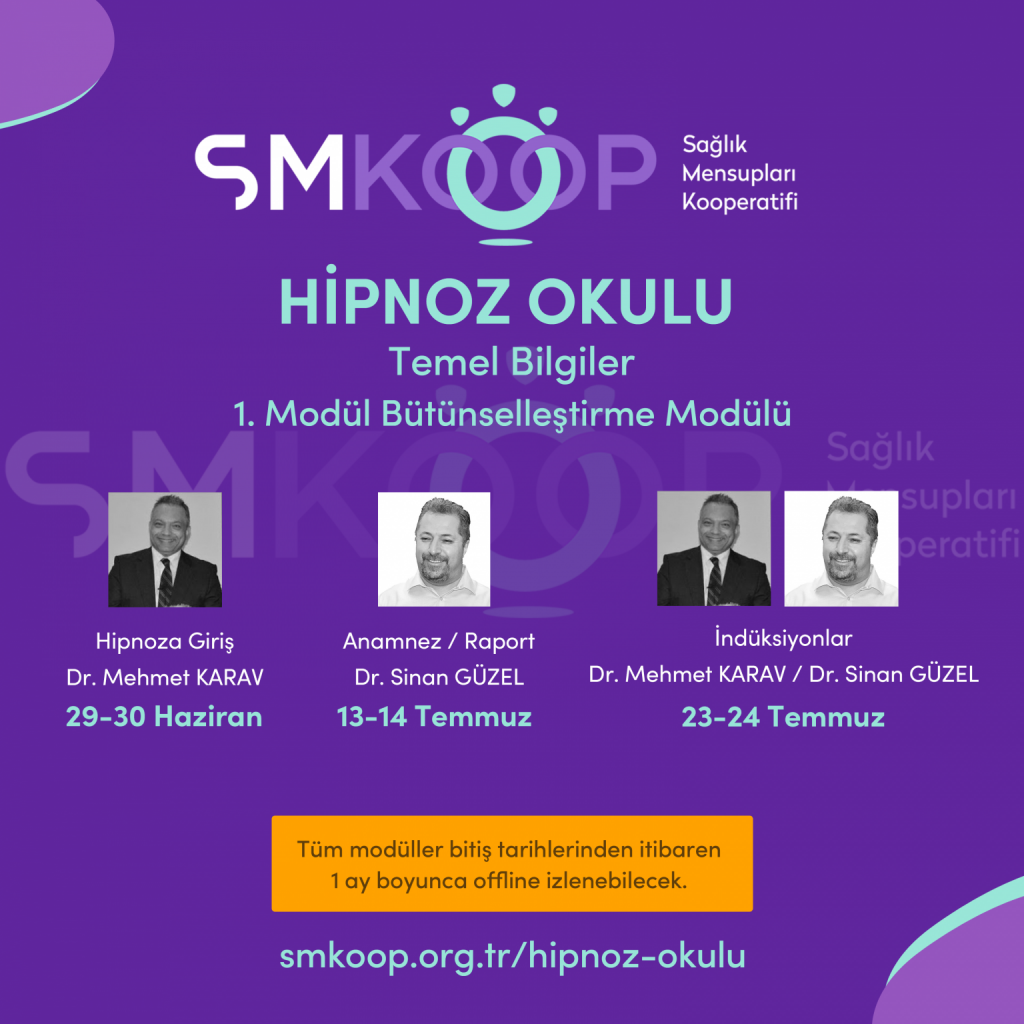 Hipnoz Okulu-Bütünselleştirme Modülü (1. Modül) başvuru ve kayıt için: https://smkoop.org.tr/hipnoz-okulu/