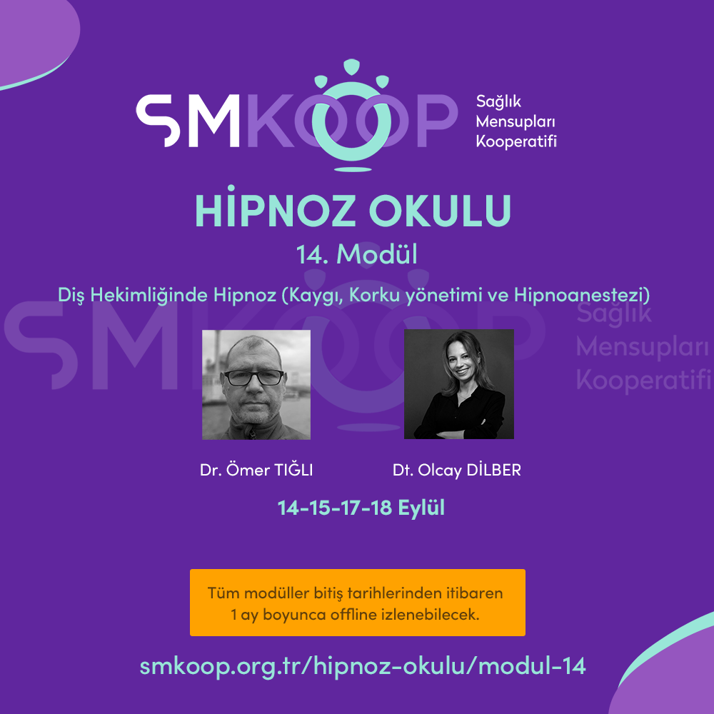 Sağlık Mensupları Kooperatifi (SMKoop) tarafından Hipnoz Okulu etkinlikleri kapsamında 14-18 Eylül 2020 tarihleri arasında toplam 4 gün (8 saat) “Hipnoz Okulu – DİŞ HEKİMLİĞİNDE HİPNOZ (Kaygı, Korku yönetimi ve Hipnoanestezi) MODÜLÜ Eğitimi” düzenlenecek
