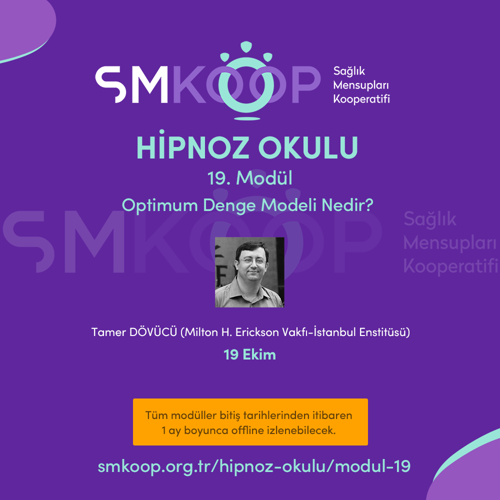 Sağlık Mensupları Kooperatifi (SMKoop) tarafından Hipnoz Okulu etkinlikleri kapsamında 19 Ekim 2020 tarihinde toplam 1 gün (2 saat) “Hipnoz Okulu – OPTİMUM DENGE MODELİ NEDİR MODÜLÜ Eğitimi” düzenlenecek