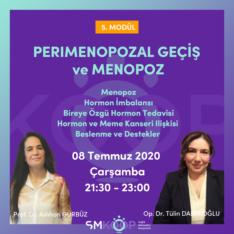 Sağlık Mensupları Kooperatifi (SMKoop) tarafından düzenlenen Kadın Sağlığı Eğitiminin beşinci modülü, PERIMENOPOZAL GEÇİŞ ve MENOPOZ konulu seminer 08 Temmuz 2020, Çarşamba günü 21.30-23.00 saatleri arasında online olarak düzenlenecek